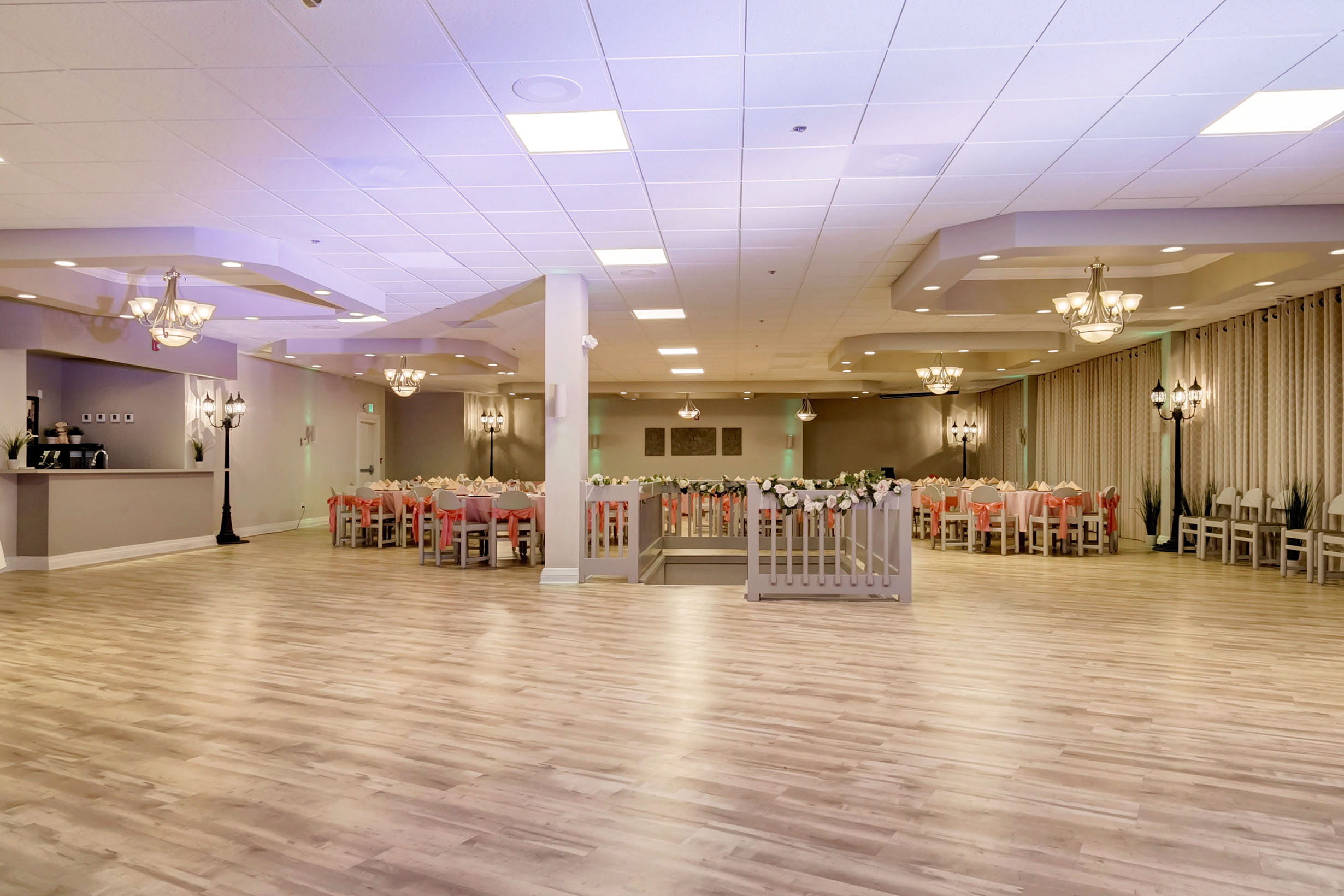 The neutral tones of the banquet room make it easy to decorate to your own taste and color scheme. The lighting and linens provided are customizable to fit with your design and the polished wood floors are perfect for dancing. This space includes a full service bar and a separate dressing room / staging area is available.
